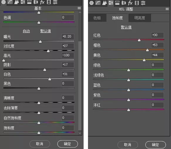 接下来,利用滤镜菜单中的Camera Raw滤镜命令,进入Camera Raw滤镜,对照片进行全方位的处理,参数设定如图所示。