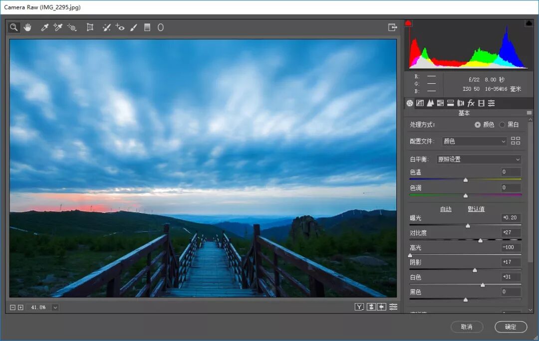 如果我们感觉功能滤镜(这里是Camera Raw滤镜)的处理效果不够理想,双击功能滤镜的链接,就可以再次回到功能滤镜当中,再次对参数等进行重新设定,相当于给了用户后悔的机会,让我们可以反复对照片的处理过程进行修改。