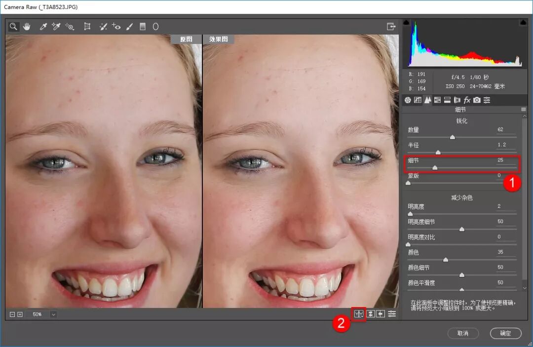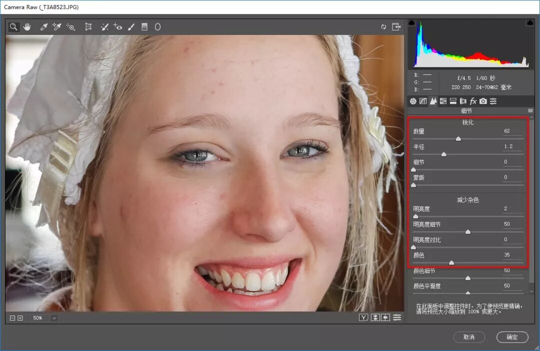 步骤4: “锐化”是指强化照片中像素之间的差别,让照片显得更加锐利、清晰,提高锐化数量值后,可以看到人物面部清晰度变高,画质更锐利。