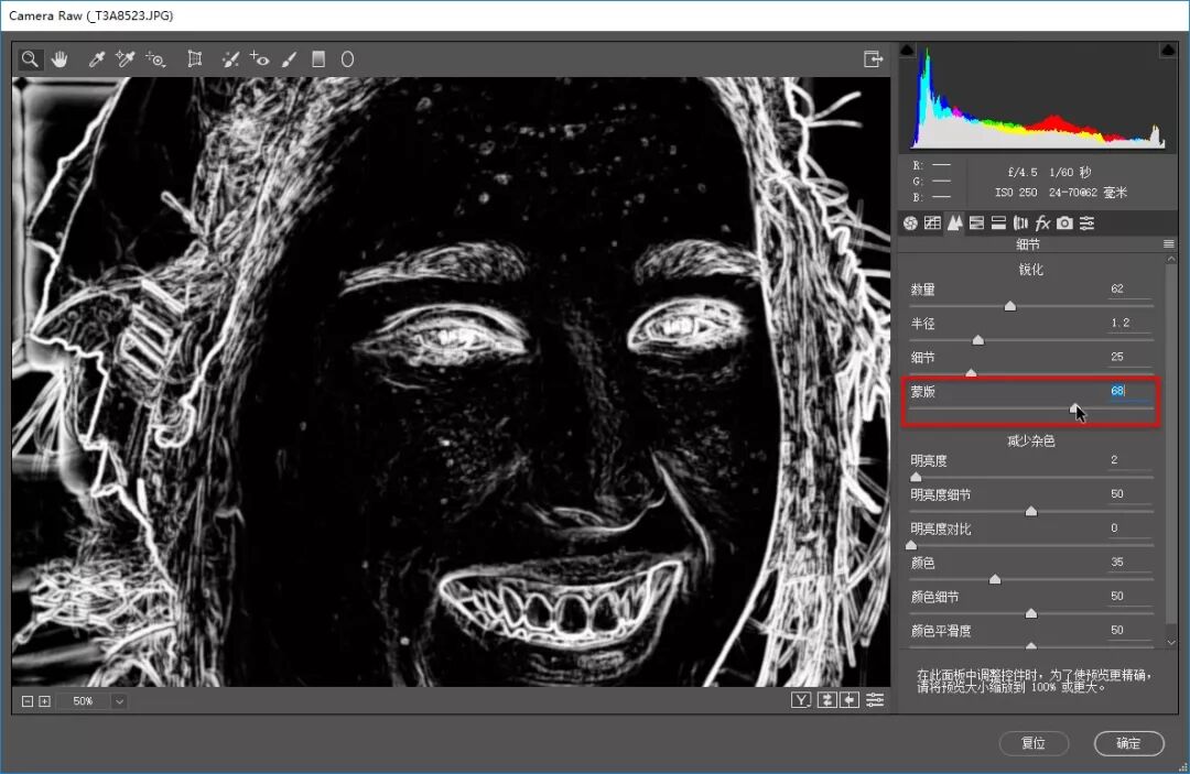 本例中提高了“蒙版”值,提高这个值时,只要在拖动“蒙版”参数时按住键盘上的Alt键,就可以显示调整的位置。按住Alt键拖动“蒙版”值,可以看到对人物面部一些明显的边缘位置,即明暗相间的部分进行了锐化,而对比较细腻的、面积比较大的腮部等则不进行锐化。这样,就更容易达到我们想要的效果。