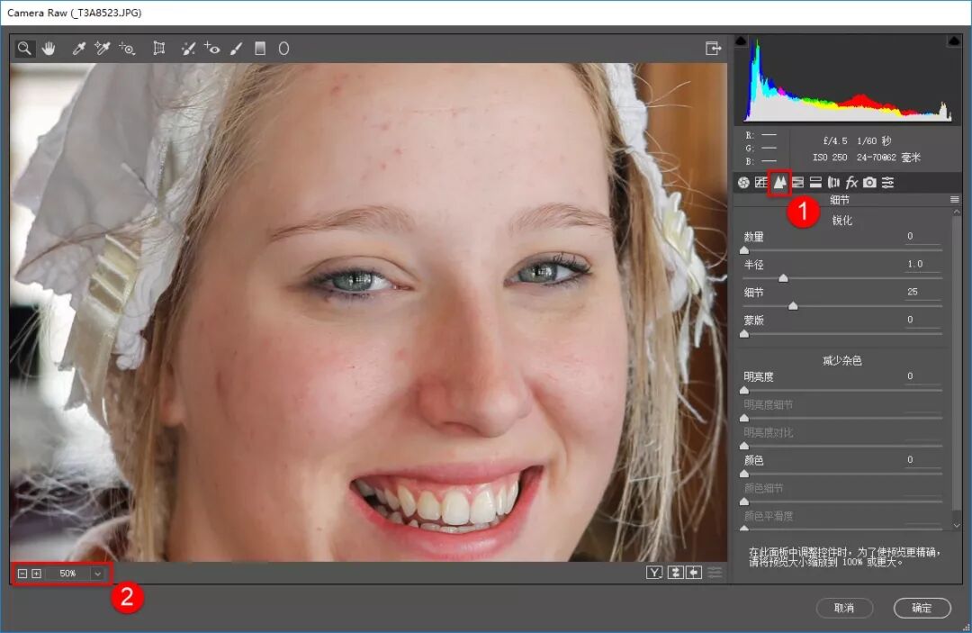 在ACR中,锐化和降噪功能被集成到了“细节”面板。
